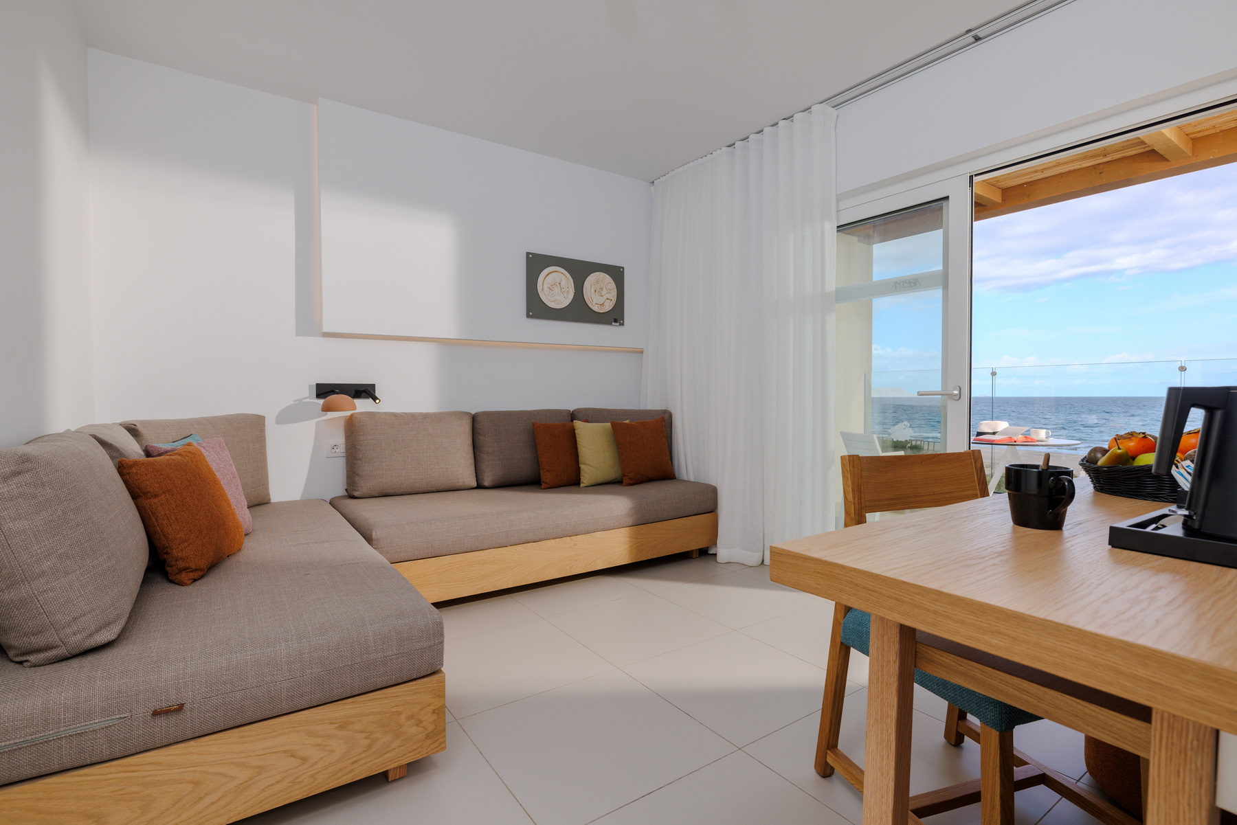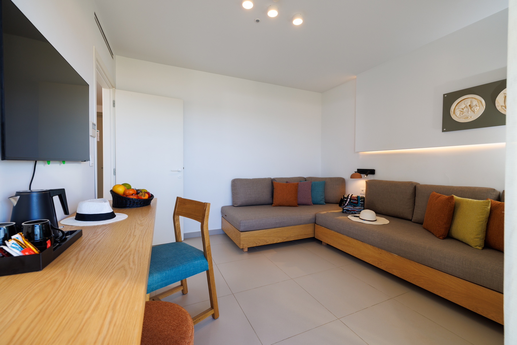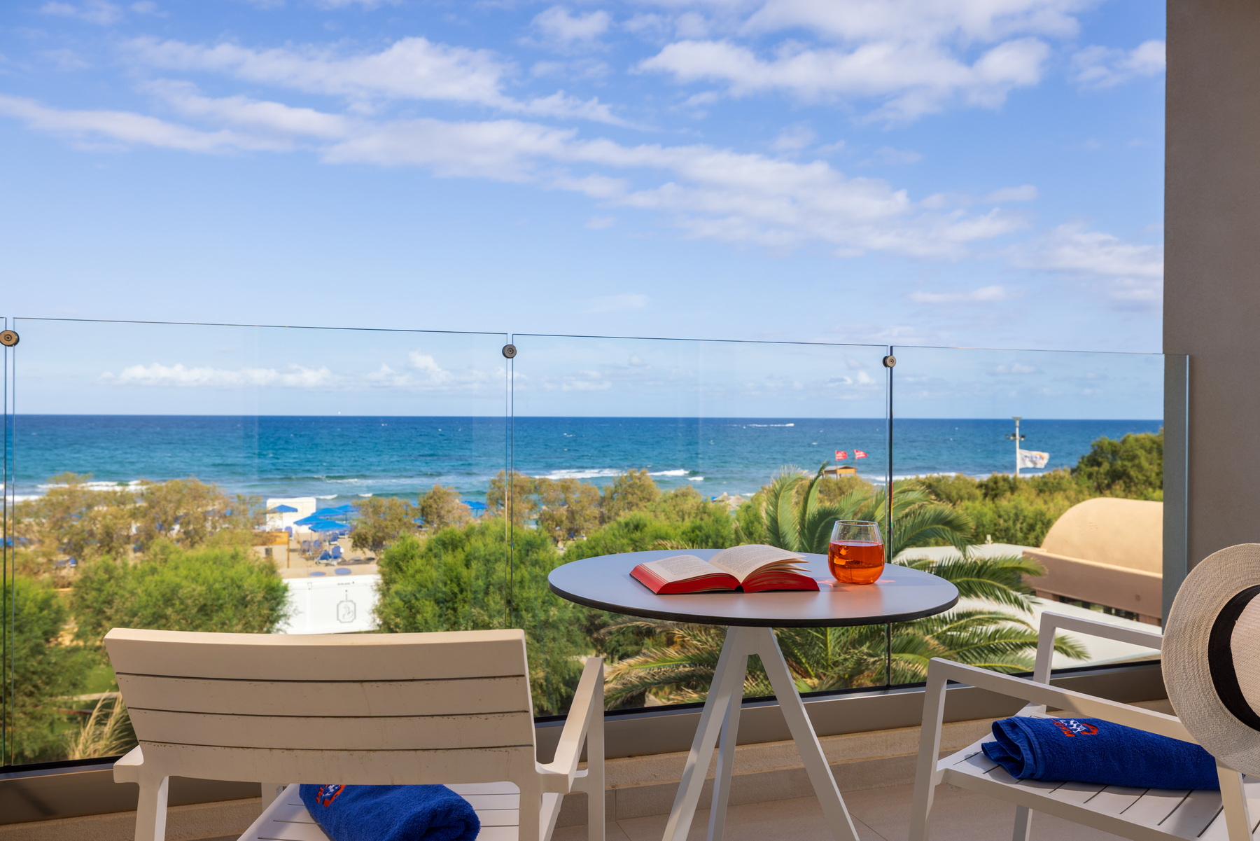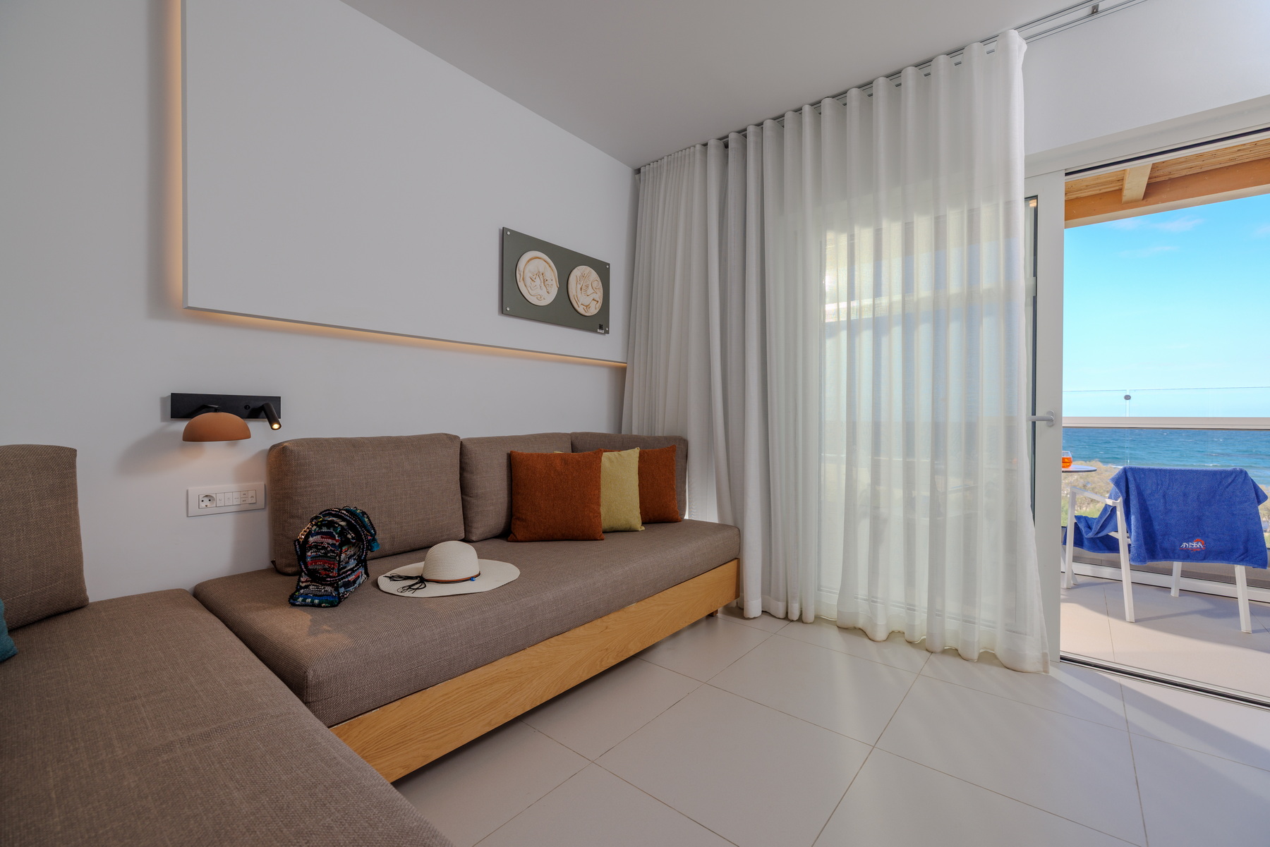 Located on the seafront of the “Knossos” building, the VIP suites offer breathtaking views over the Cretan Sea. The master bedroom with twin beds and the living/sleeping area with two sofas that convert into beds for a third and fourth person have separate doors, and the shared bathroom is situated in between. Enjoy our additional amenities – bathrobes, slippers, coffee/tea station, and a daily refilled minibar (water, soft drinks, beer)..