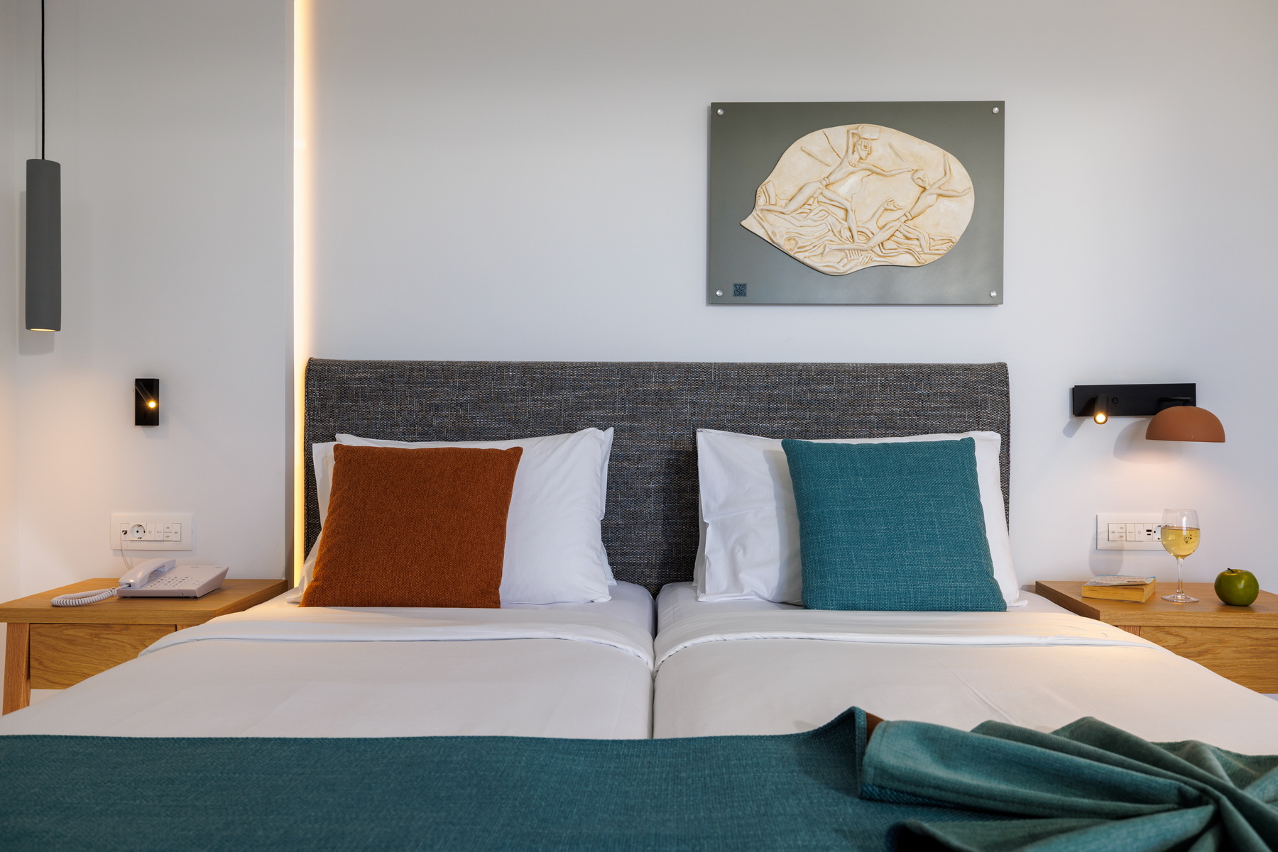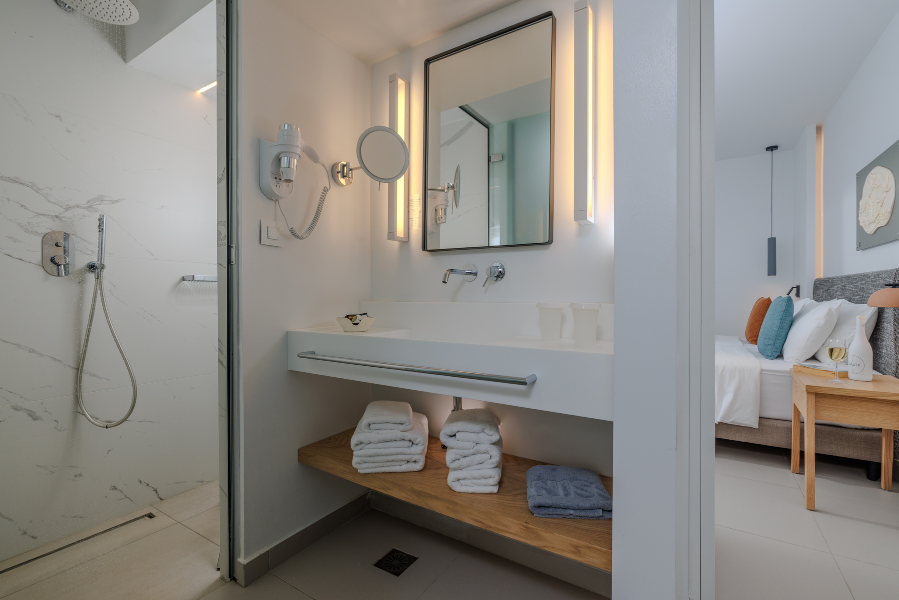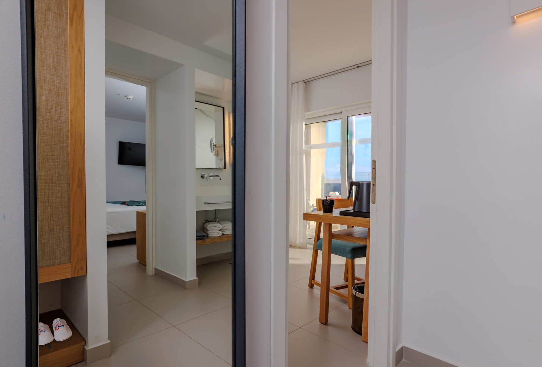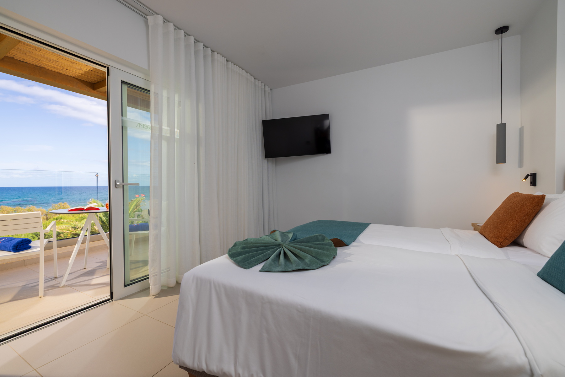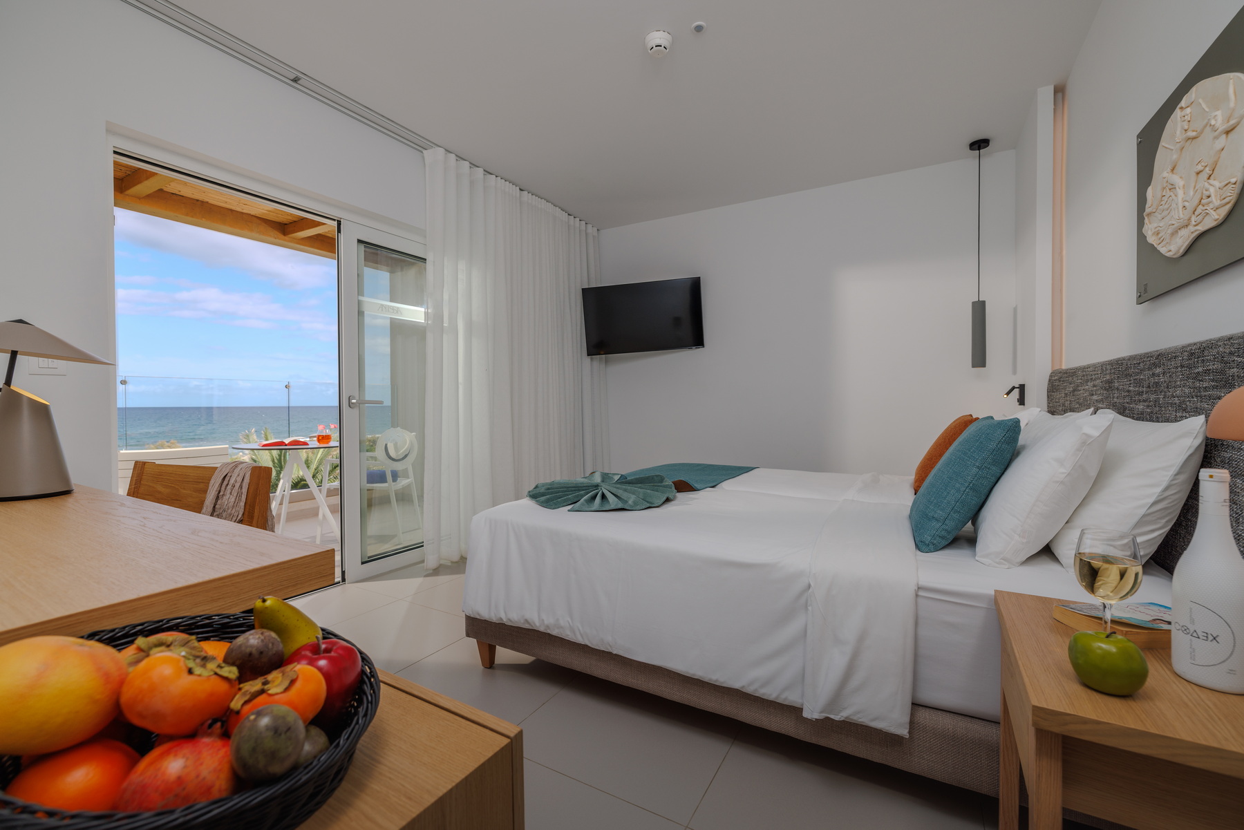 Located on the seafront of the “Knossos” building, the VIP suites offer breathtaking views over the Cretan Sea. The master bedroom with twin beds and the living/sleeping area with two sofas that convert into beds for a third and fourth person have separate doors, and the shared bathroom is situated in between. Enjoy our additional amenities – bathrobes, slippers, coffee/tea station, and a daily refilled minibar (water, soft drinks, beer)..
